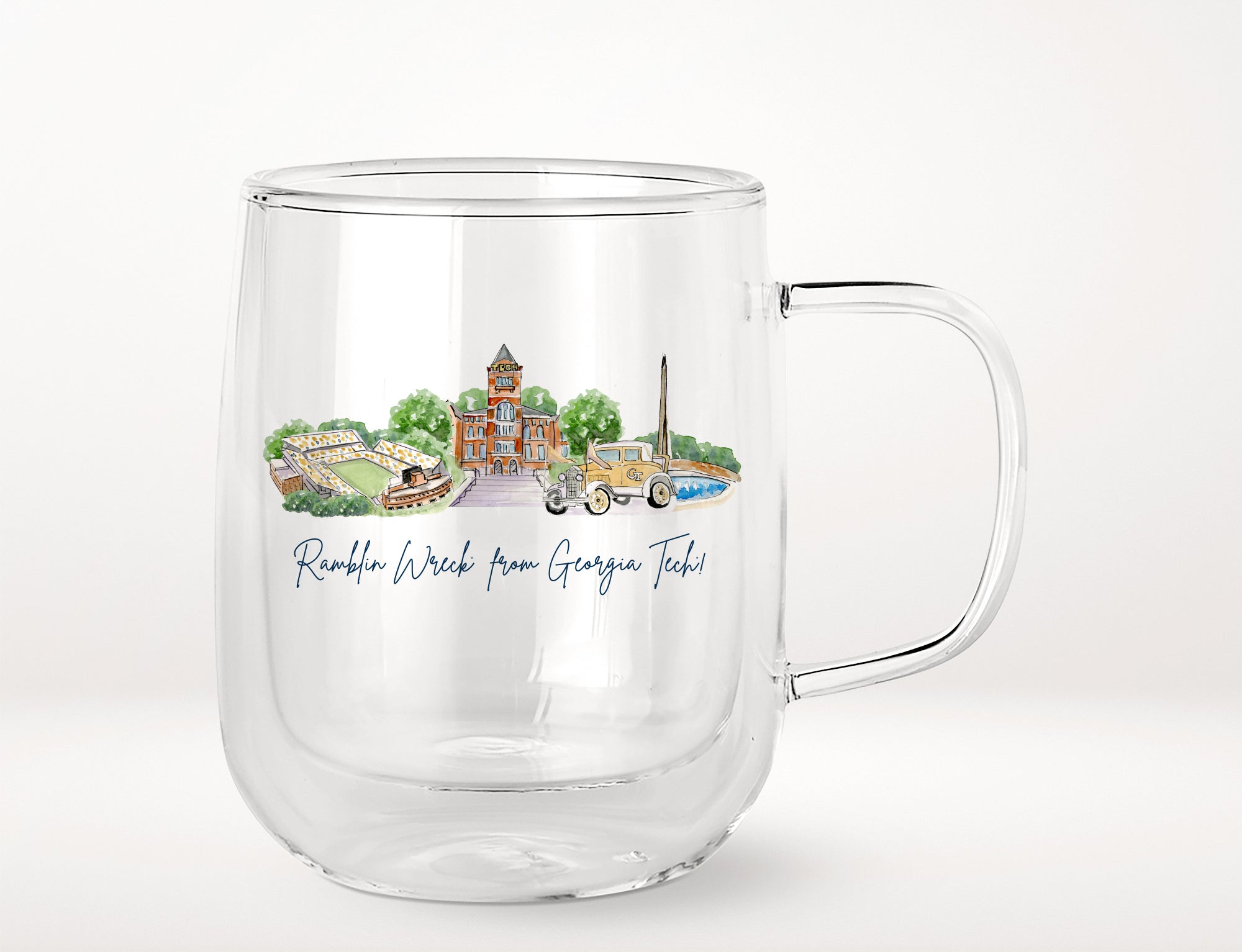 Show your Georgia Tech spirit with this officially licensed 16 oz glass mug. Made from durable glass, it features a bold, long-lasting logo. The sturdy handle ensures a comfortable grip, perfect for hot or cold drinks. Ideal for home, office, or game day—sip in style and cheer on your team!